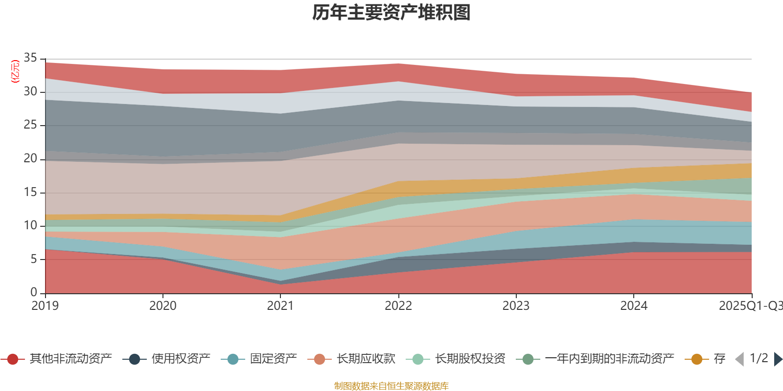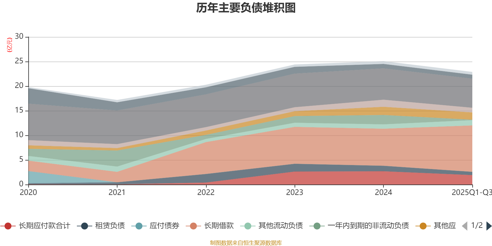 负债重大变化方面,截至2025年三季度末,公司长期借款较上年末增加25.23%,占公司总资产比重上升8.08个百分点;一年内到期的非流动负债较上年末减少95.7%,占公司总资产比重下降5.64个百分点;长期应付款合计较上年末减少28.89%,占公司总资产比重下降1.97个百分点;合同负债较上年末减少34.1%,占公司总资产比重下降1.31个百分点。