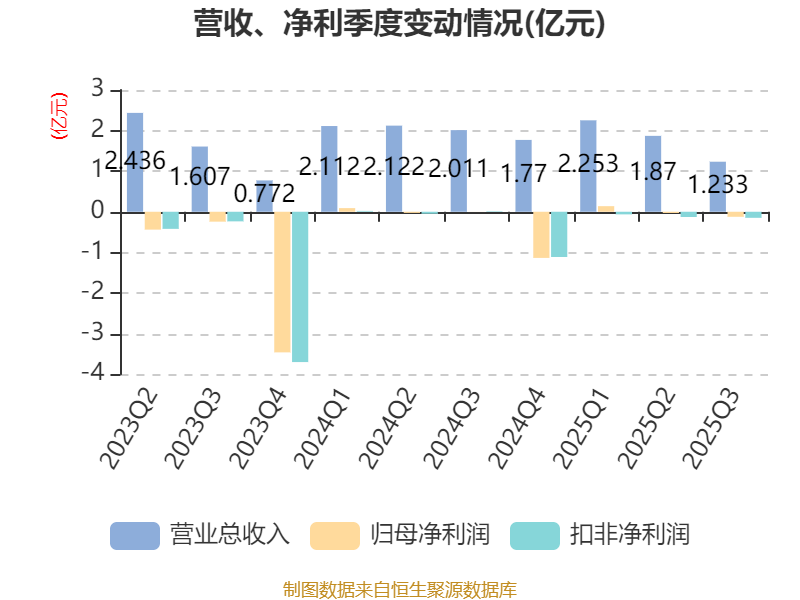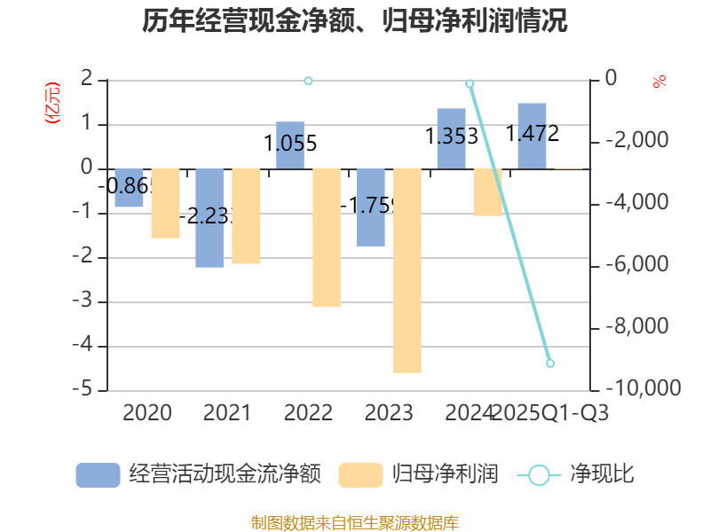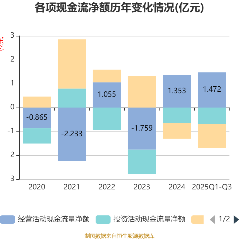 2025年前三季度,公司经营活动现金流净额为1.47亿元,同比增长39.9%;筹资活动现金流净额-1.01亿元,同比减少7746.79万元;投资活动现金流净额-6746.38万元,上年同期为-6121.32万元。