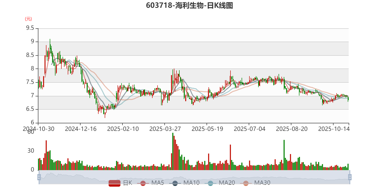 中证智能财讯海利生物(603718)10月30日披露2025年第三季度报告。前三季度公司实现营业总收入1.5亿元,同比下降14.15%;归母净利润2032.97万元,同比增长0.77%;扣非净利润1647.3万元,同比扭亏;经营活动产生的现金流量净额为3677.18万元,同比增长69.59%;报告期内,海利生物基本每股收益为0.031元,加权平均净资产收益率为1.29%。