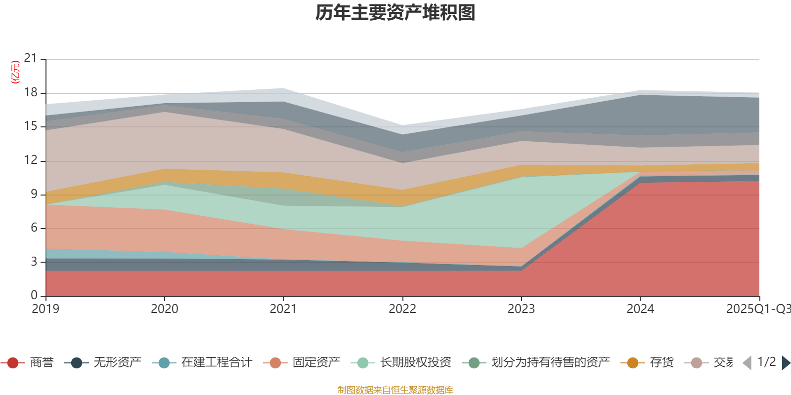 资产重大变化方面,截至2025年三季度末,公司货币资金较上年末减少13.53%,占公司总资产比重下降2.43个百分点;商誉较上年末增加1.45%,占公司总资产比重上升1.53个百分点;长期待摊费用较上年末增加174.57%,占公司总资产比重上升0.58个百分点;固定资产较上年末增加32.8%,占公司总资产比重上升0.55个百分点。