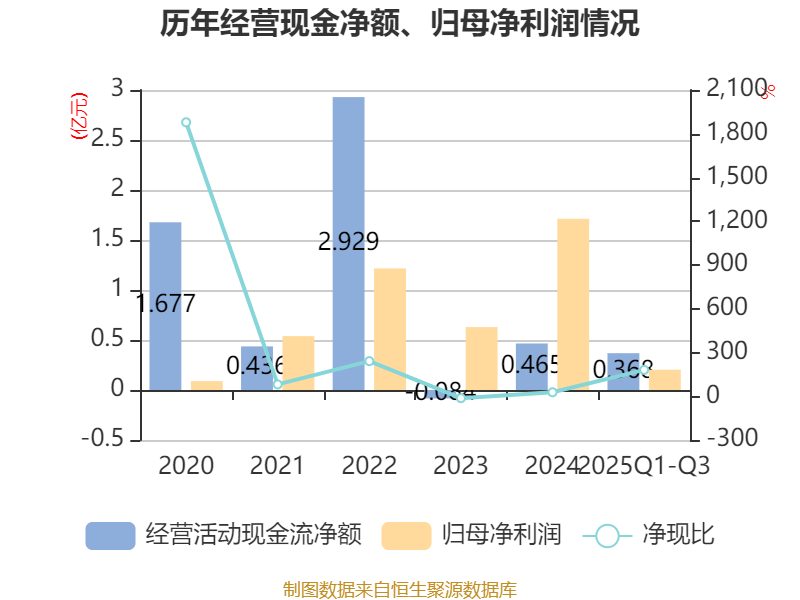 2025年前三季度,公司经营活动现金流净额为3677.18万元,同比增长69.59%;筹资活动现金流净额-5992.23万元,同比减少1450.17万元;投资活动现金流净额-2433.41万元,上年同期为-3582.72万元。