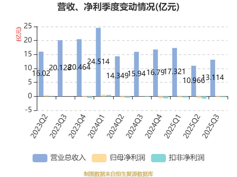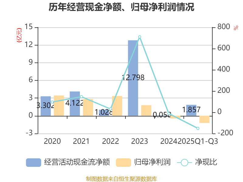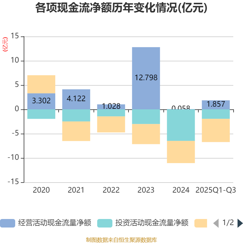 2025年前三季度,公司经营活动现金流净额为1.86亿元,同比增长143.39%;筹资活动现金流净额-4.78亿元,同比增加440.97万元;投资活动现金流净额-1.95亿元,上年同期为-9.92亿元。