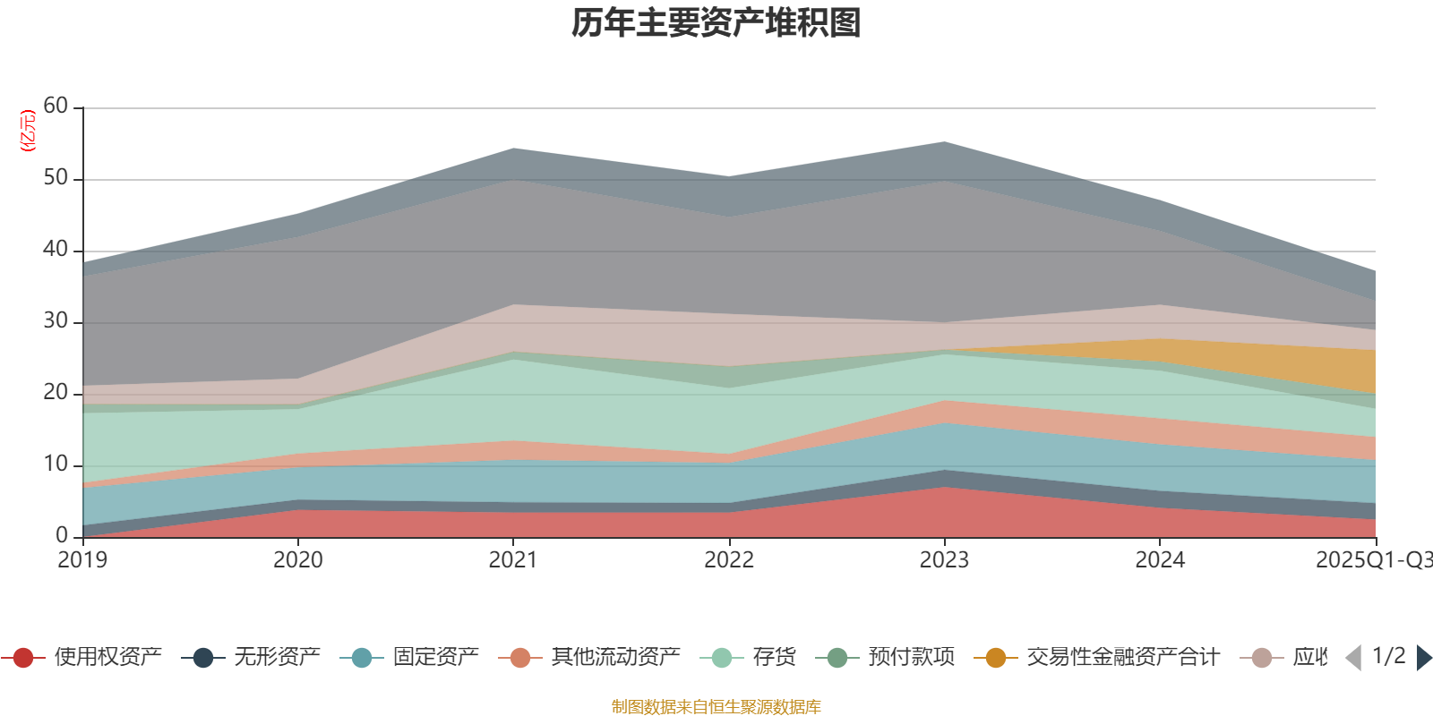资产重大变化方面,截至2025年三季度末,公司货币资金较上年末减少60.44%,占公司总资产比重下降10.95个百分点;交易性金融资产合计较上年末增加86.77%,占公司总资产比重上升9.4个百分点;存货较上年末减少40.65%,占公司总资产比重下降3.51个百分点;预付款项较上年末增加67.13%,占公司总资产比重上升3.02个百分点。