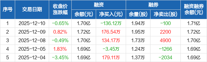 良品铺子:融资净偿还136.12万元,融资余额1.7亿元(12-10)
