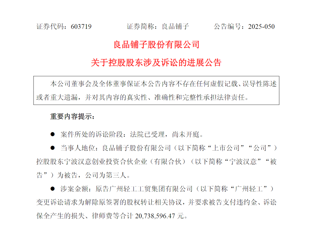 但宁波汉意及其一致行动人在2025年5月28日没有与广州轻工签署相关股权交易协议。为此,广州轻工向宁波汉意发出《关于督促签署交易协议的函》,并于7月14日就股权转让纠纷对宁波汉意提起诉讼,以及申请了财产保全,冻结宁波汉意所持良品铺子约7976万股股份。该笔股份占良品铺子总股本的19.89%,占宁波汉意所持股份的56.46%。