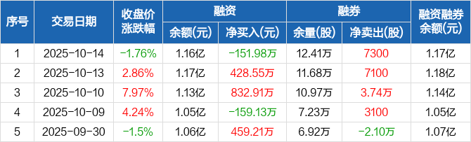 岱美股份:融资净偿还151.98万元,融资余额1.16亿元(10-14)