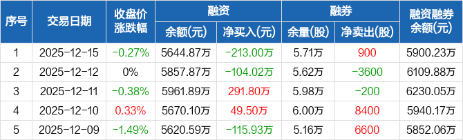 三棵树:融资净偿还213万元,融资余额5644.87万元(12-15)