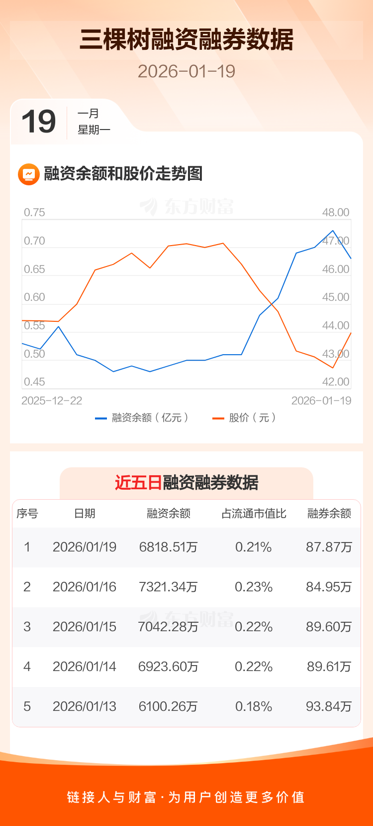 交易所最新数据显示,三棵树于2026年1月19日获融资买入643.32万元,融资偿还1146.15万元,当日融资净偿还502.83万元。目前,该股融资余额6818.51万,占流通市值比例为0.21%。