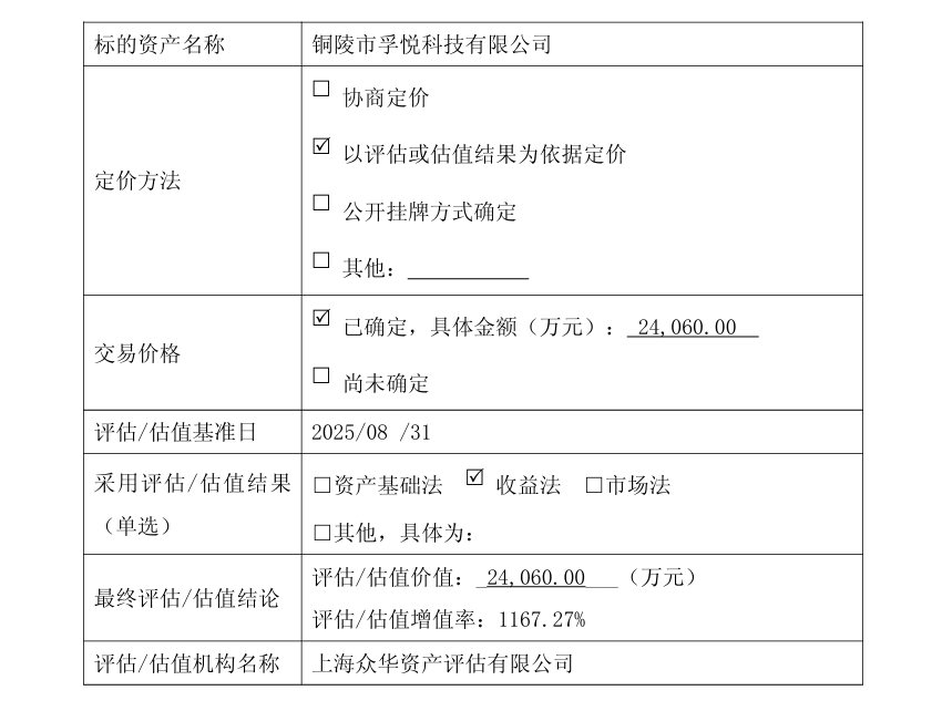 公告显示,本次交易采用收益法作为收购孚悦科技股权价值参考依据。以2025年8月31日为评估基准日,孚悦科技的股东全部权益评估值约为2.41亿元,评估增值约2.22亿元,增值率为1167.27%。