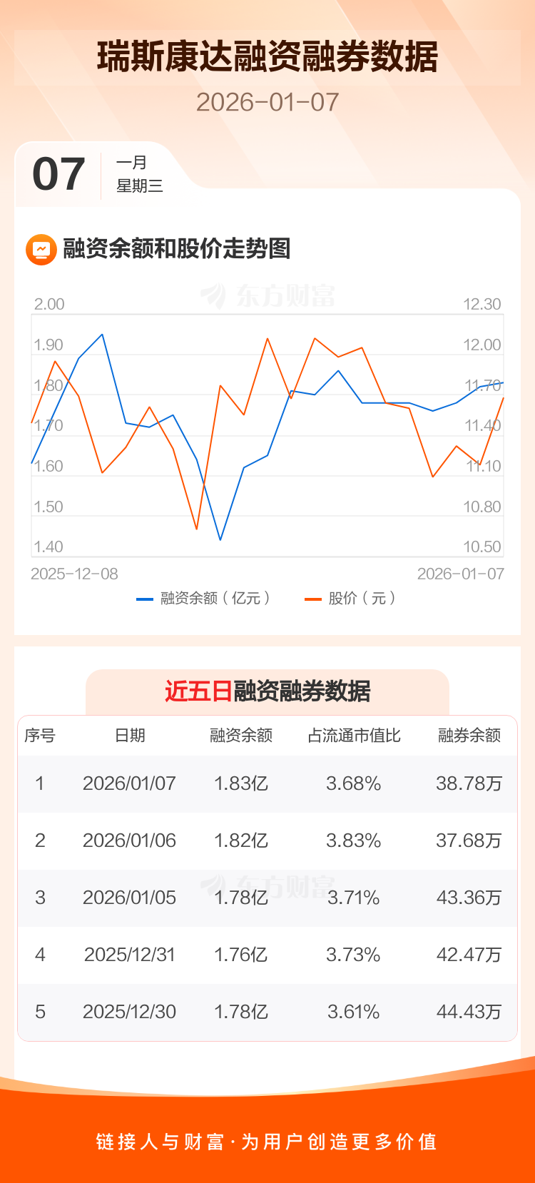 交易所最新数据显示,瑞斯康达于2026年1月7日获融资买入4988.92万元,融资偿还4946.46万元,当日融资净买入42.45万元。目前,该股融资余额1.83亿,占流通市值比例为3.68%。