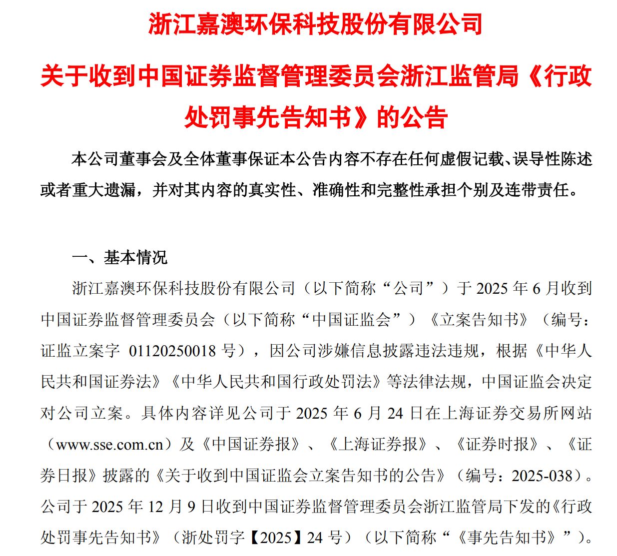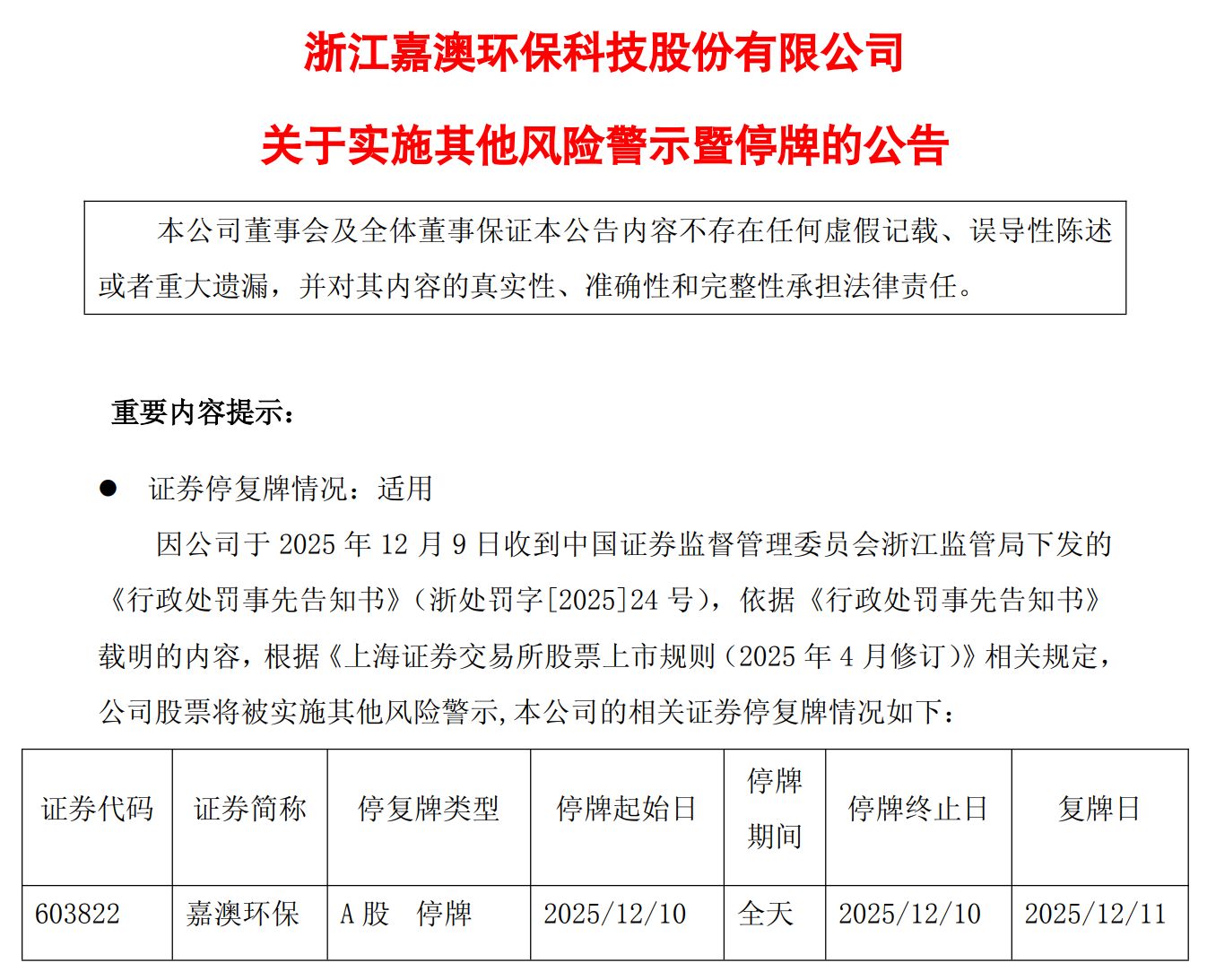 12月9日晚间,嘉澳环保公告称,公司当日收到中国证券监督管理委员会浙江证监局下发的《行政处罚事先告知书》,根据相关规定,公司股票将被实施其他风险警示。公司股票将于2025年12月10日停牌一天,2025年12月11日复牌后,公司A股股票简称将由“嘉澳环保”变更为“ST嘉澳”,股票价格的日涨跌幅限制为5%。