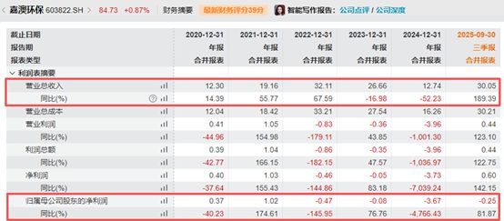 每经记者梳理发现,近年来嘉澳环保业绩持续承压。2022—2024年,公司营收同比增速分别为67.59%、-16.98%、-52.23%,归母净利润连续三年为负值。不过今年前三季度,嘉澳环保营收同比大幅增长189.39%至30.05亿元,归母净利润为-0.25亿元,亏损同比大幅收窄。
