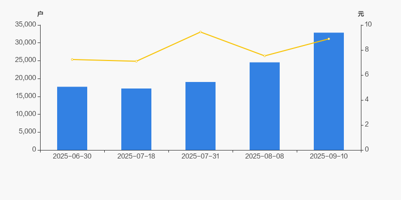 自2025年7月18日以来,公司股东户数连续3期上涨,截至目前增幅为90.81%。2025年7月18日至2025年9月10日区间股价上涨25.21%。