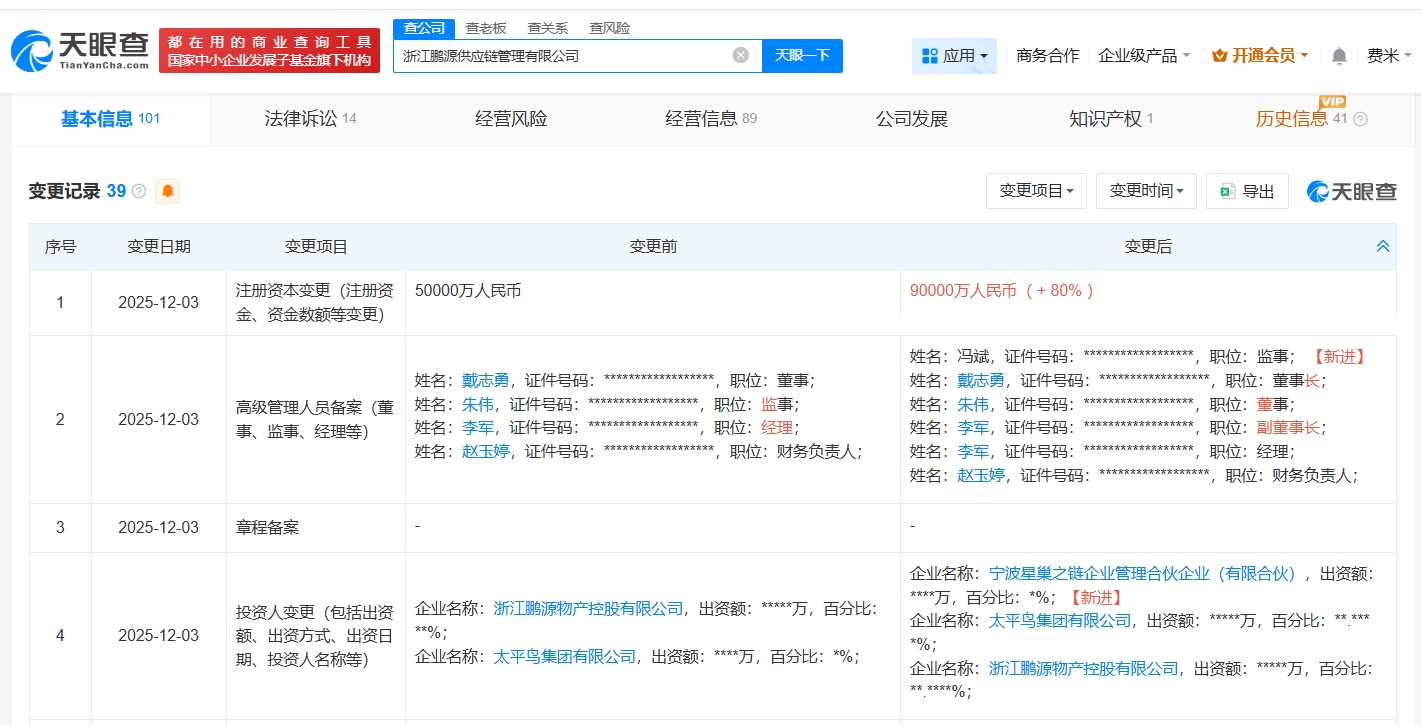 太平鸟集团旗下鹏源供应链管理公司增资至9亿