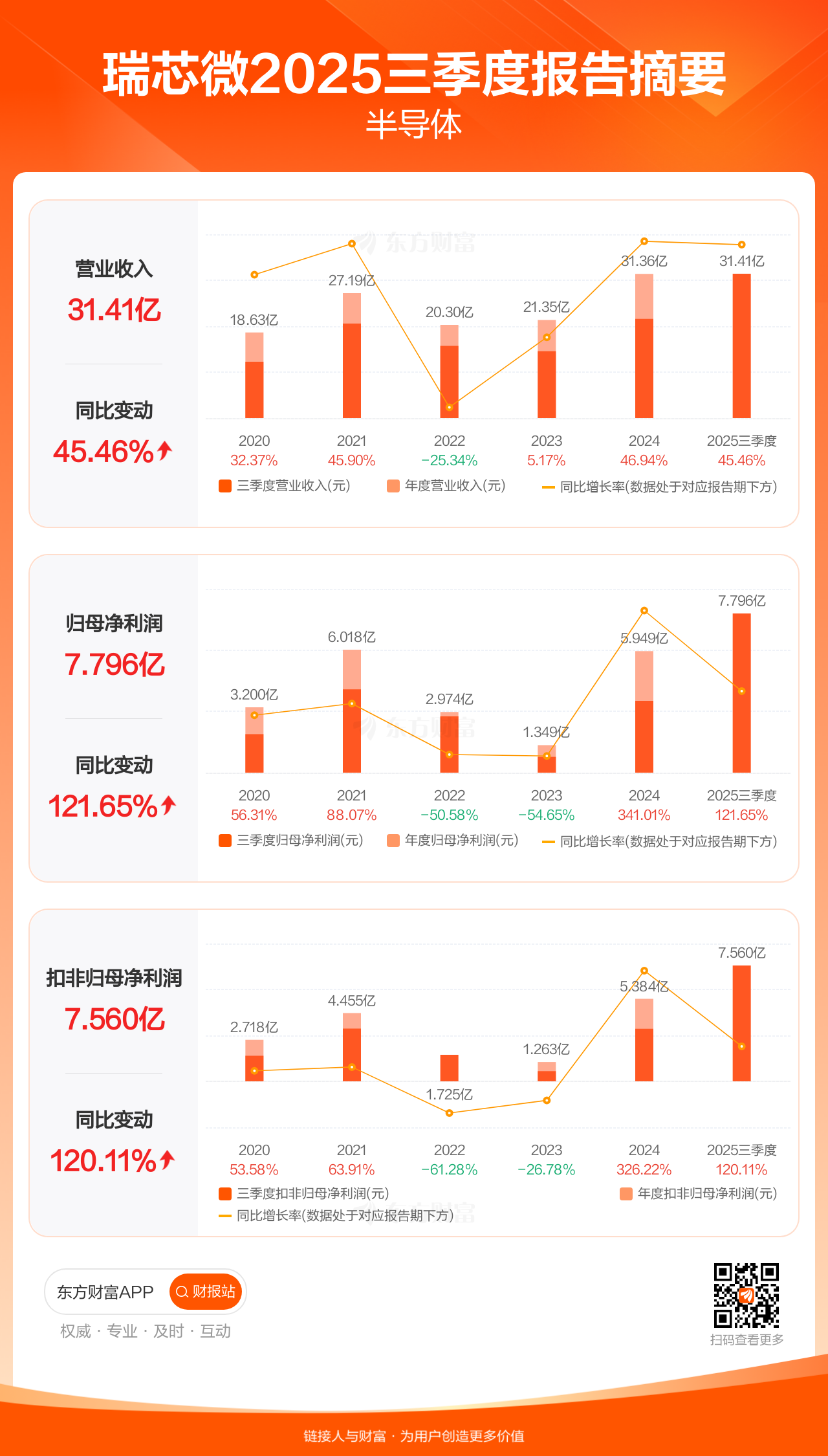 瑞芯微10月28日发布2025年三季报显示,公司前三季实现营业收入31.41亿元,同比增长45.46%;归母净利润7.80亿元,同比增长121.65%;扣非归母净利润7.56亿元,同比增长120.11%。