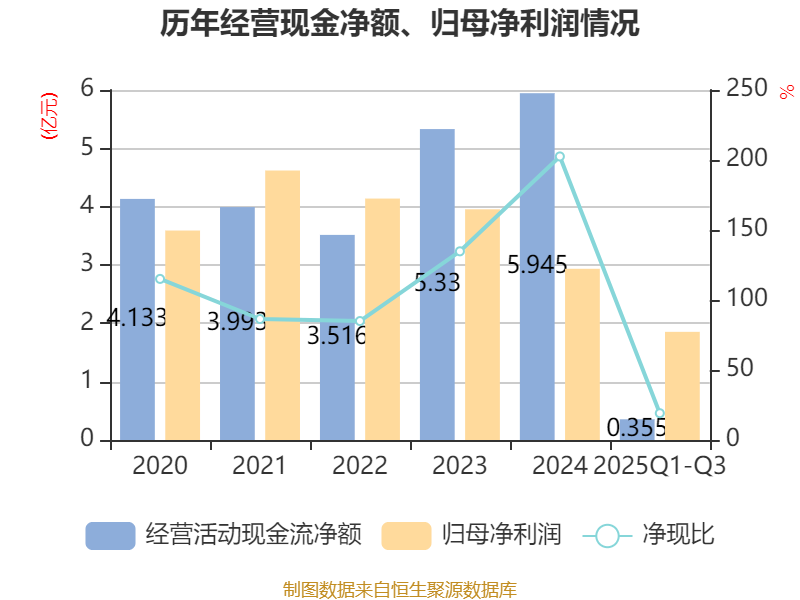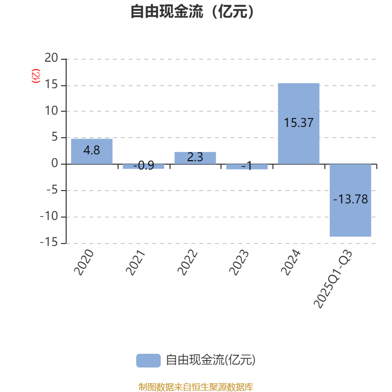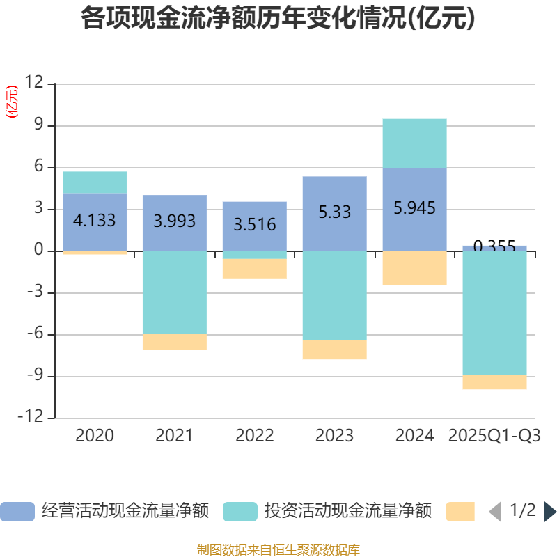 2025年前三季度,公司经营活动现金流净额为3547.12万元,同比下降89.1%;筹资活动现金流净额-1.06亿元,同比增加5320.74万元;投资活动现金流净额-8.9亿元,上年同期为-3.49亿元。