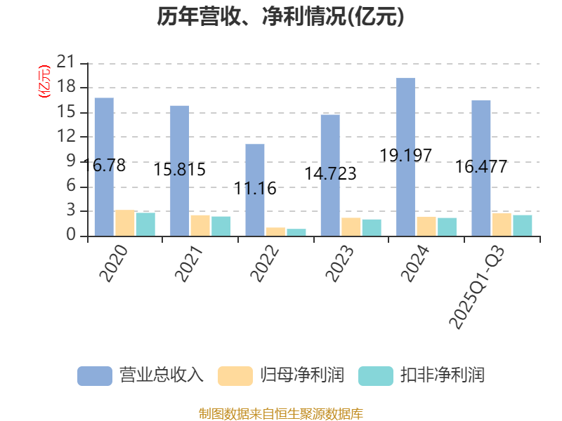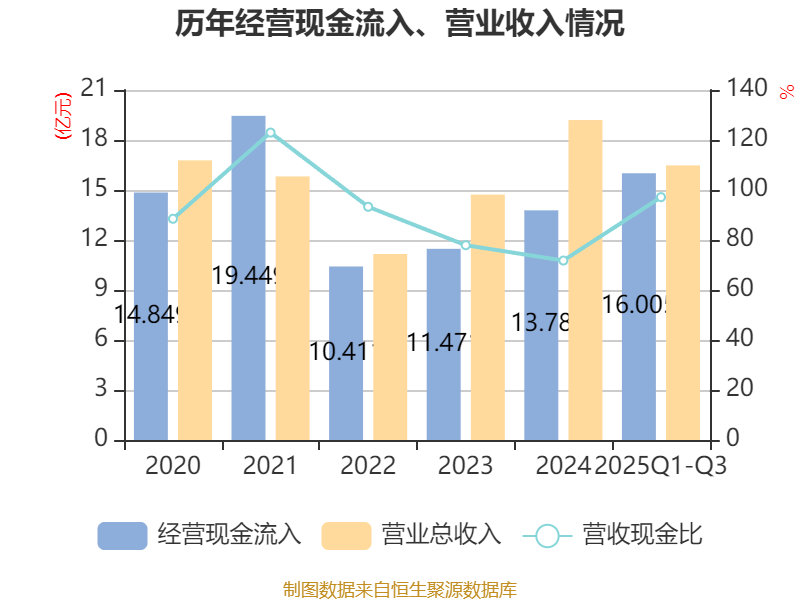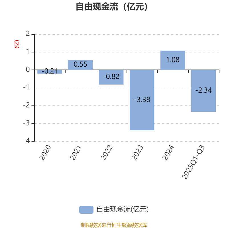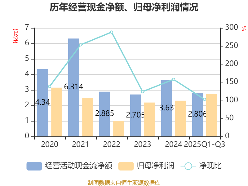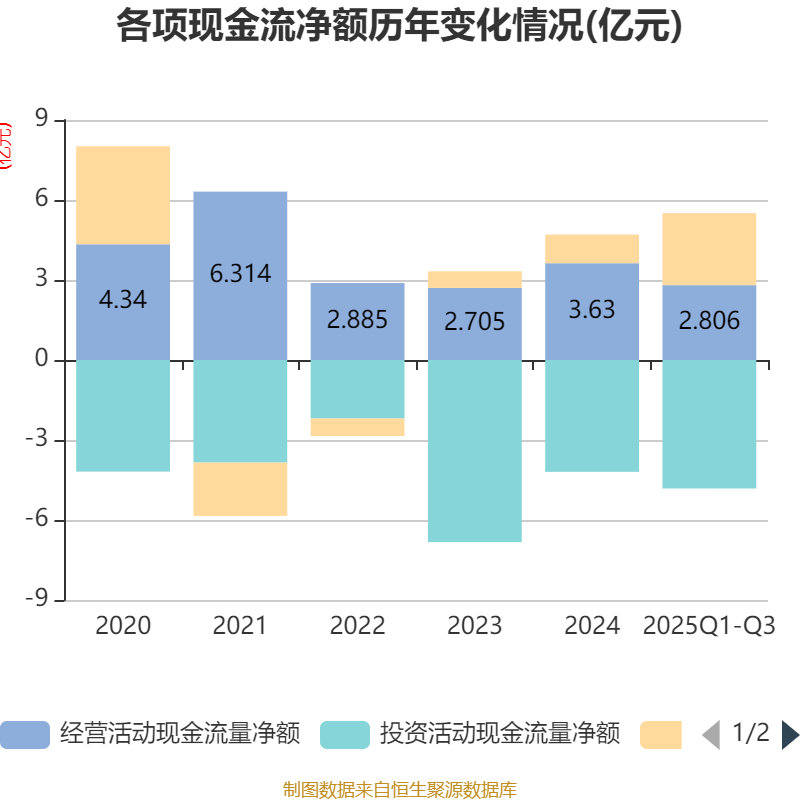2025年前三季度,公司经营活动现金流净额为2.81亿元,同比下降15.98%;筹资活动现金流净额2.7亿元,同比增加1.24亿元;投资活动现金流净额-4.82亿元,上年同期为-2.62亿元。