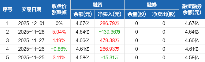 融资方面,当日融资买入1803.68万元,融资偿还1516.9万元,融资净买入286.79万元。融券方面,融券卖出0股,融券偿还0股,融券余量0股,融券余额0元。融资融券余额合计4.67亿元。
