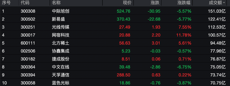 个股方面,中际旭创半日成交额超150亿元居首位,新易盛、光线传媒、网宿科技、北方稀土等公司成交额靠前。