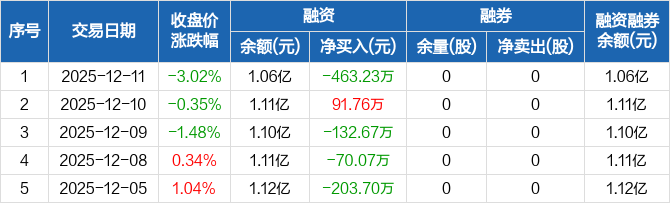 泉峰汽车融资融券信息显示,2025年12月11日融资净偿还463.23万元;融资余额1.06亿元,较前一日下降4.19%