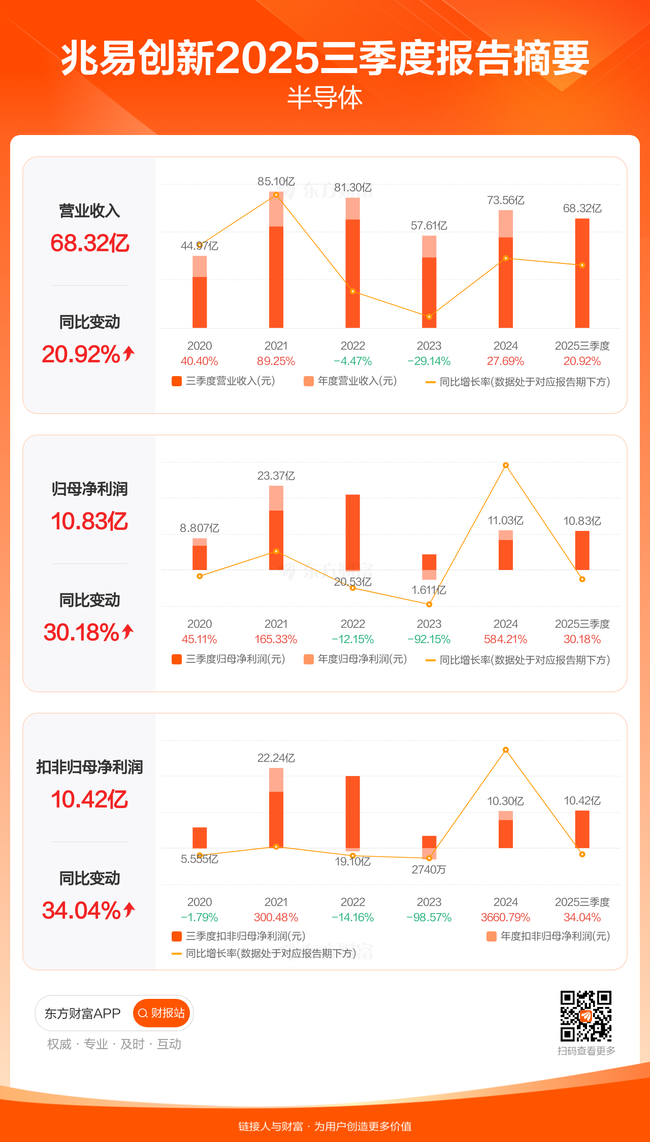 兆易创新10月29日发布2025年三季报显示,公司前三季实现营业收入68.32亿元,同比增长20.92%;归母净利润10.83亿元,同比增长30.18%;扣非归母净利润10.42亿元,同比增长34.04%。