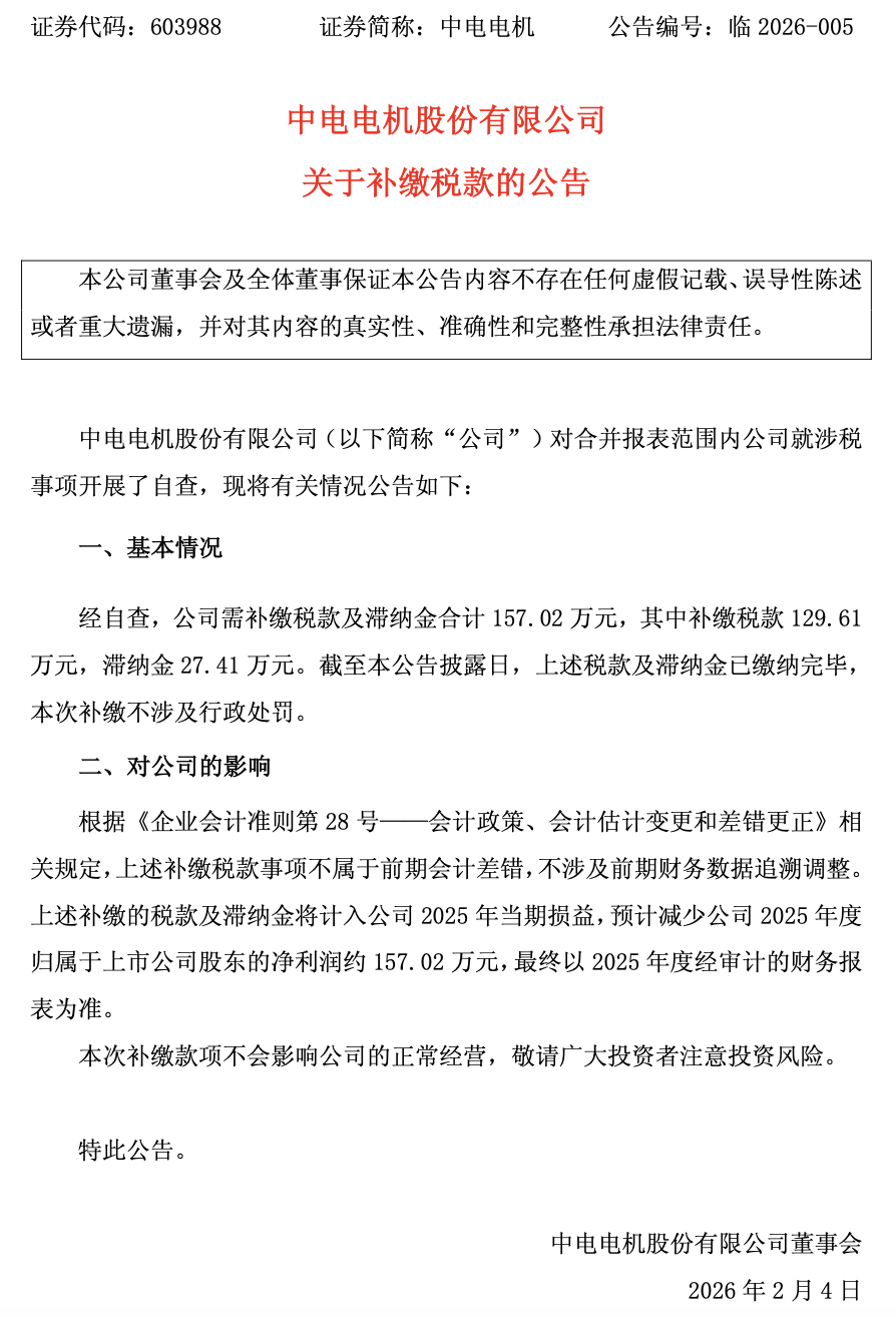 中电电机表示,根据相关规定,上述补缴税款事项不属于前期会计差错,不涉及前期财务数据追溯调整。上述补缴的税款及滞纳金将计入公司2025年当期损益,预计减少公司2025年度归属于上市公司股东的净利润约157.02万元,最终以2025年度经审计的财务报表为准。