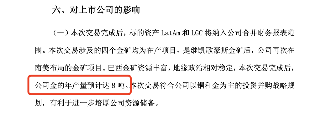 据悉,待上述交易完成后,洛阳钼业黄金业务年产量将新增约8吨。