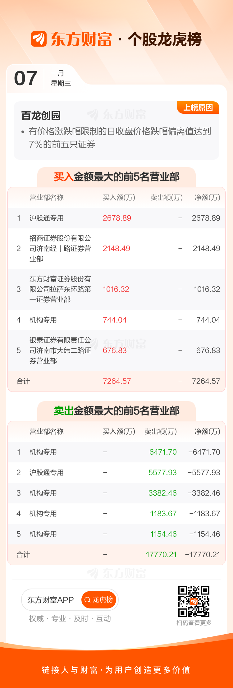 交易所2026年1月7日公布的交易公开信息显示,百龙创园因成为有价格涨跌幅限制的日收盘价格跌幅偏离值达到7%的前五只证券上榜。百龙创园当日收报20.45元,涨跌幅-7.42%,偏离值-7.48%,换手率4.08%,成交额3.55亿。