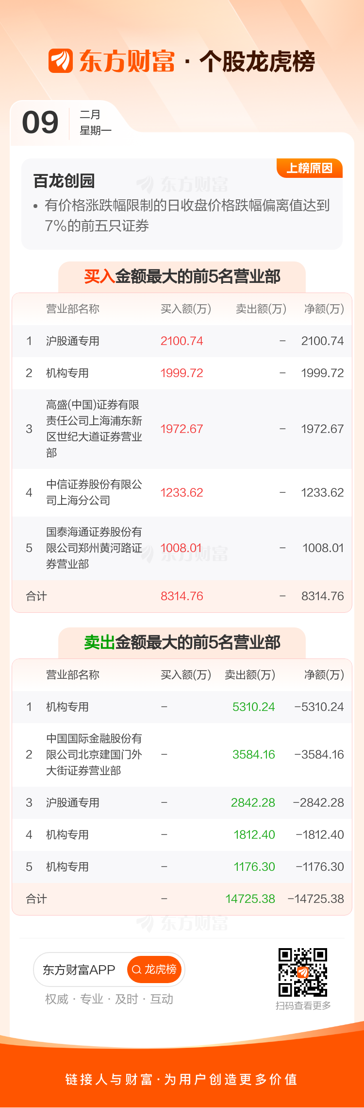 交易所2026年2月9日公布的交易公开信息显示,百龙创园因成为有价格涨跌幅限制的日收盘价格跌幅偏离值达到7%的前五只证券上榜。百龙创园当日收报25.24元,涨跌幅-5.82%,偏离值-7.24%,换手率4.00%,成交额4.29亿。