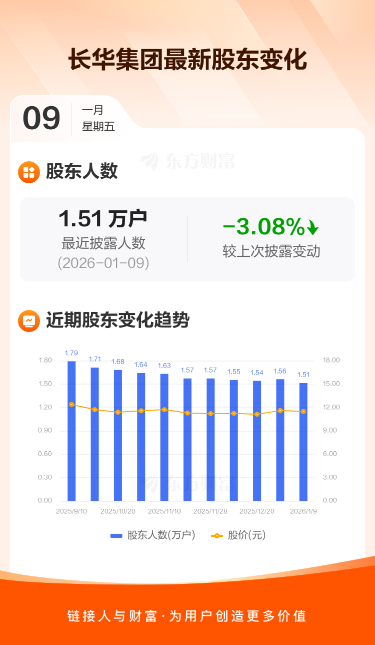 长华集团:截至1月9日最新股东户数1.51万户,较上期减少3.08%