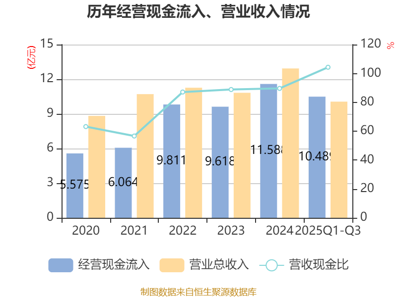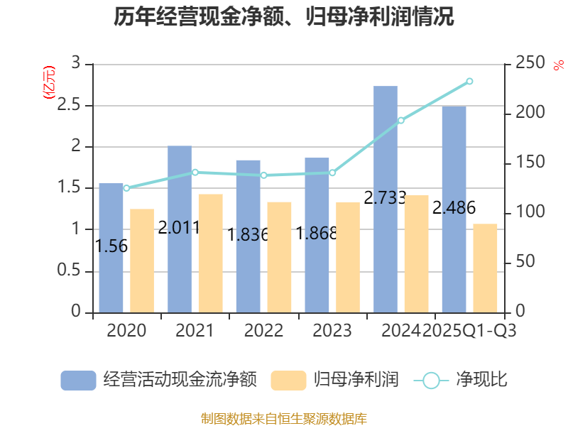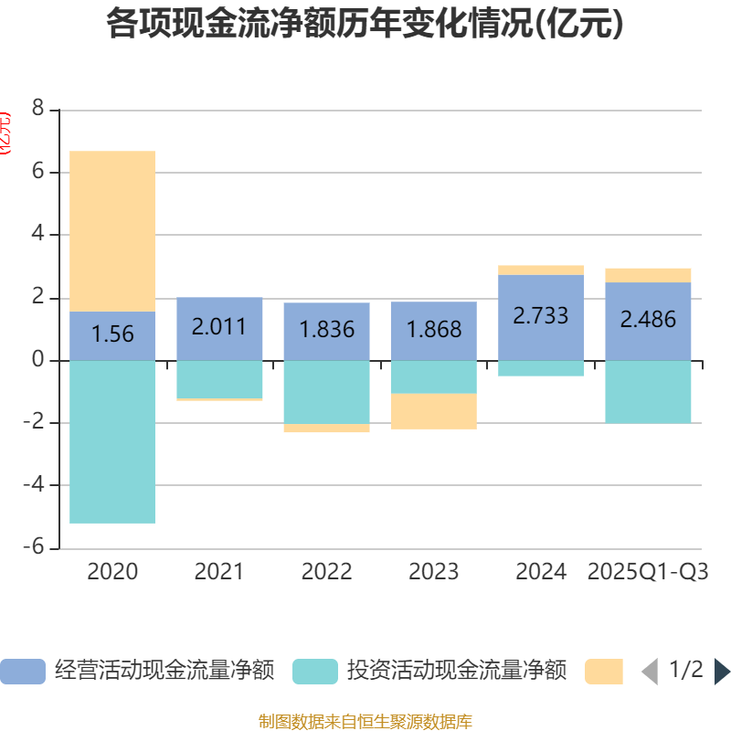 2025年前三季度,公司经营活动现金流净额为2.49亿元,同比增长69.33%;筹资活动现金流净额4469.54万元,同比增加9209.81万元;投资活动现金流净额-2.01亿元,上年同期为735.88万元。