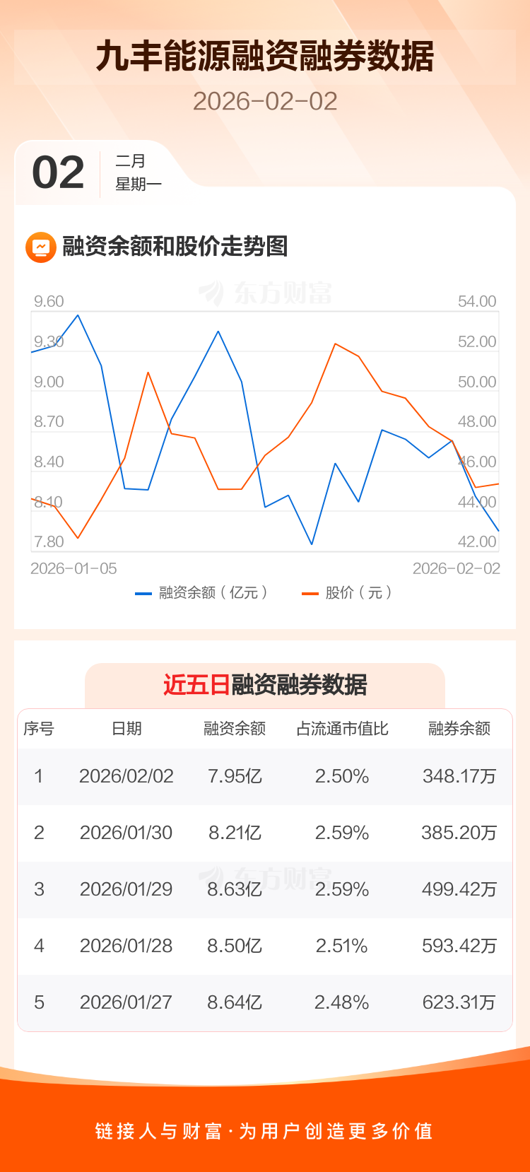 交易所最新数据显示,九丰能源于2026年2月2日获融资买入6920.33万元,融资偿还9478.65万元,当日融资净偿还2558.32万元。目前,该股融资余额7.95亿,占流通市值比例为2.50%。