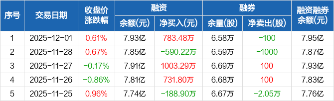 融资方面,当日融资买入3639.51万元,融资偿还2856.03万元,融资净买入783.48万元。融券方面,融券卖出1300股,融券偿还1400股,融券余量6.58万股,融券余额229.31万元。融资融券余额合计7.95亿元。