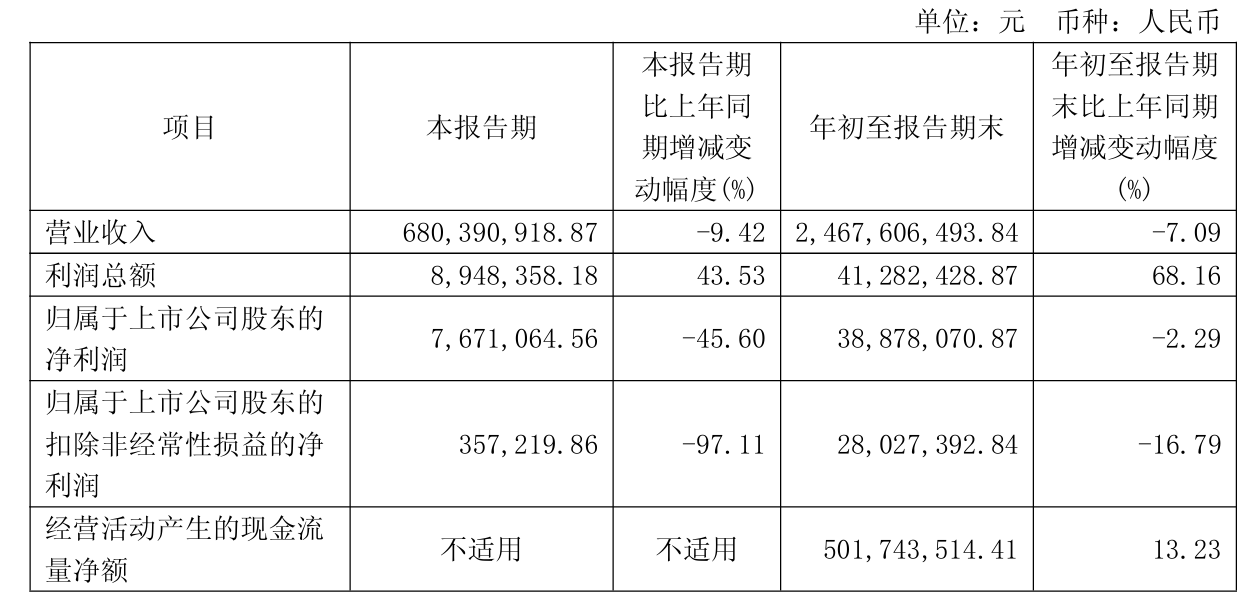 2025年前三季度,盛泰集团业绩持续承压,公司营业收入为24.68亿元,同比下降7.09%;归母净利润为3887.81万元,同比下降2.29%;扣非归母净利润为2802.74万元,同比下降16.79%