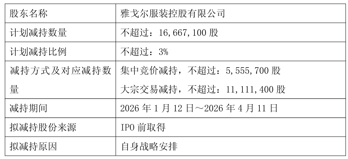 12月17日晚间,盛泰集团(605138)发布公告称,公司持股12.61%股东雅戈尔服装计划在2026年1月12日至2026年4月11日期间,减持不超过1666.71万股,占公司总股本的3%。