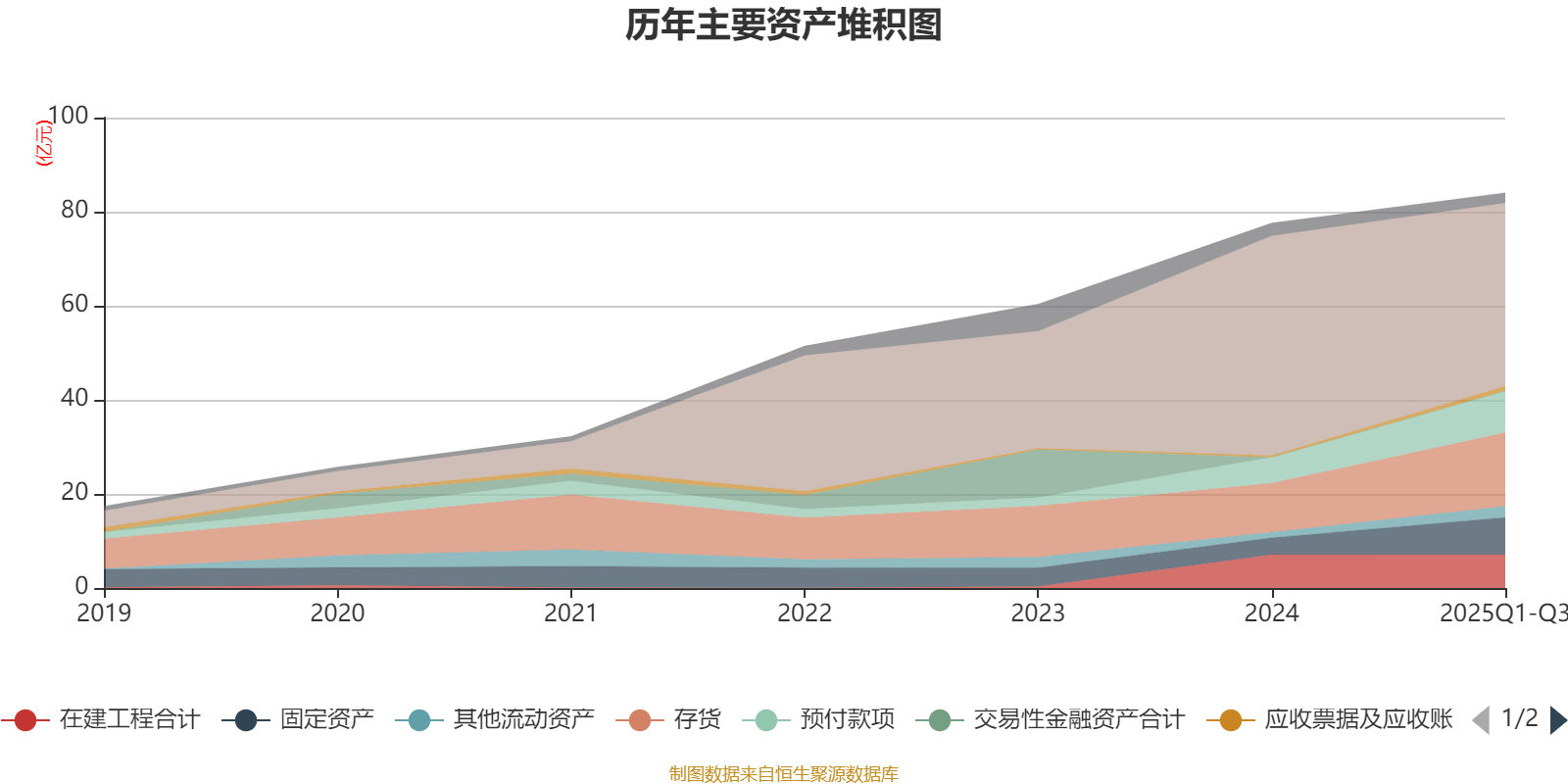 资产重大变化方面,截至2025年三季度末,公司货币资金较上年末减少16.63%,占公司总资产比重下降13.84个百分点;存货较上年末增加50.05%,占公司总资产比重上升5.17个百分点;固定资产较上年末增加121.04%,占公司总资产比重上升4.81个百分点;预付款项较上年末增加60.54%,占公司总资产比重上升3.43个百分点。