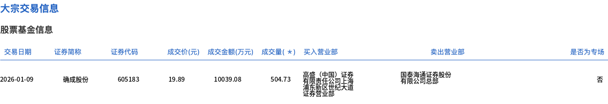 确成股份今日大宗交易平价成交504.73万股,成交额1亿元