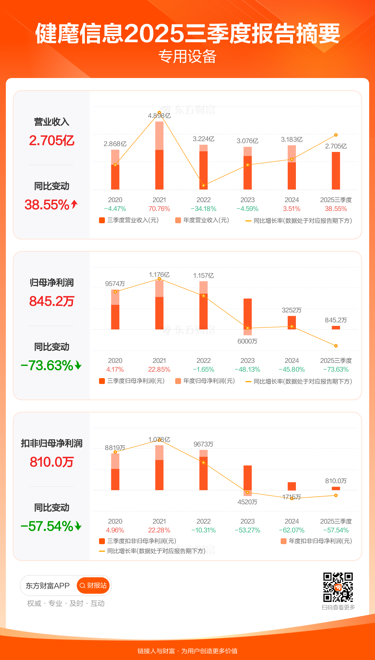 健麾信息10月30日发布2025年三季报显示,公司前三季实现营业收入2.70亿元,同比增长38.55%;归母净利润845.21万元,同比下滑73.63%;扣非归母净利润810.03万元,同比下滑57.54%。