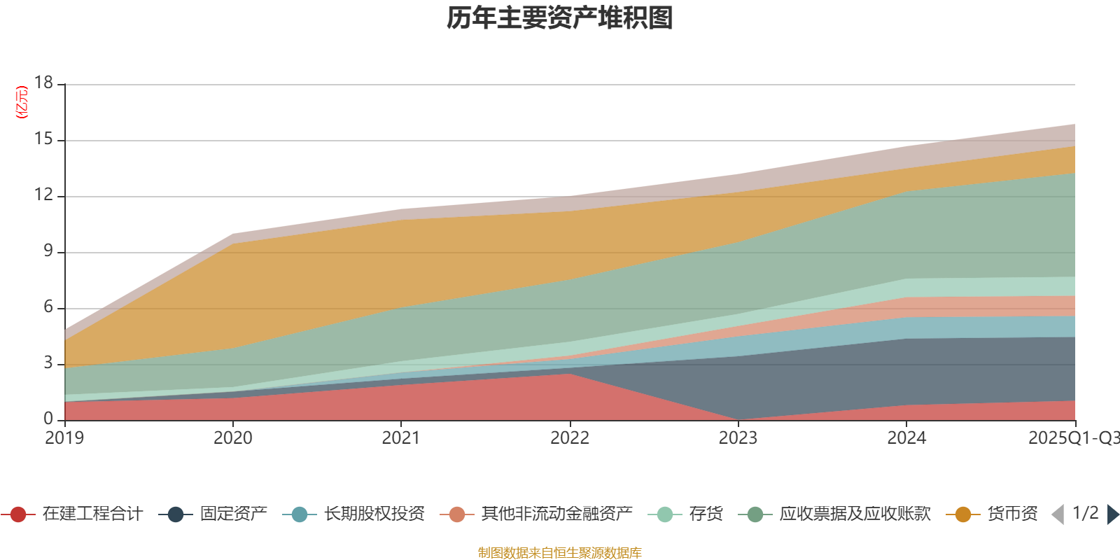 资产重大变化方面,截至2025年三季度末,公司应收票据及应收账款较上年末增加19.14%,占公司总资产比重上升3.23个百分点;固定资产较上年末减少4.12%,占公司总资产比重下降2.75个百分点;在建工程合计较上年末增加29.78%,占公司总资产比重上升1.09个百分点;长期股权投资较上年末减少1.58%,占公司总资产比重下降0.7个百分点。