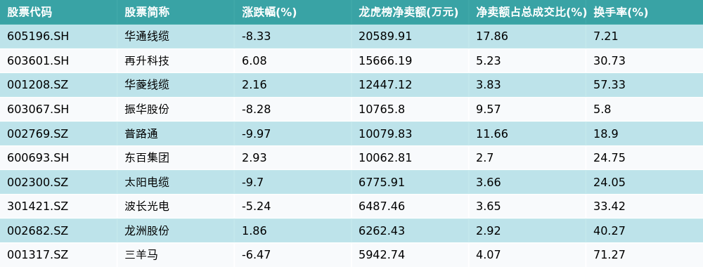南财智讯12月18日电,南财金融终端数据显示,因当日异动登上龙虎榜的个股中,龙虎榜中资金净流出最多的前三位分别是华通线缆(605196.SH)、再升科技(603601.SH)与华菱线缆(001208.SZ)。其中排名第一的华通线缆被净卖出2.06亿元,占总成交金额的17.86%。华通线缆收盘下跌8.33%,换手率为7.21%。净卖出额前10个股详情见下图: