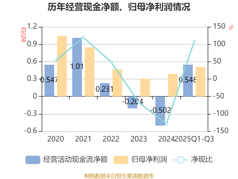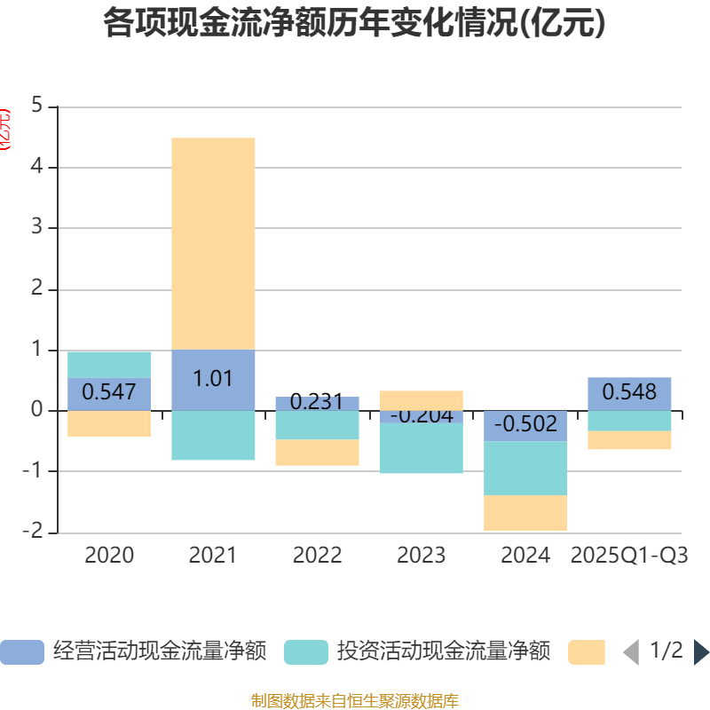 2025年前三季度,公司经营活动现金流净额为5483.78万元,同比增加9068.67万元;筹资活动现金流净额-2981.18万元,同比增加1399.44万元;投资活动现金流净额-3338.03万元,上年同期为-8192.2万元。