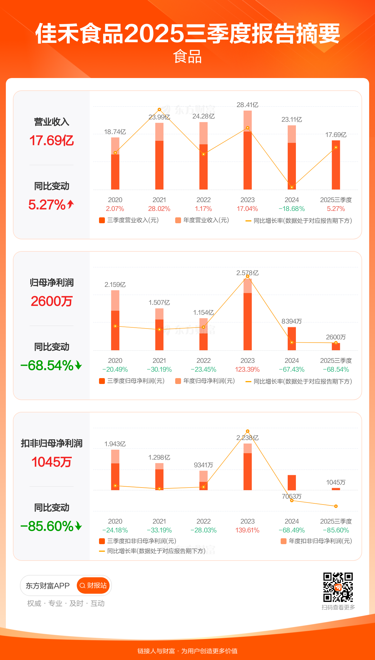 佳禾食品10月29日发布2025年三季报显示,公司前三季实现营业收入17.69亿元,同比增长5.27%;归母净利润2600.12万元,同比下滑68.54%;扣非归母净利润1044.86万元,同比下滑85.60%。