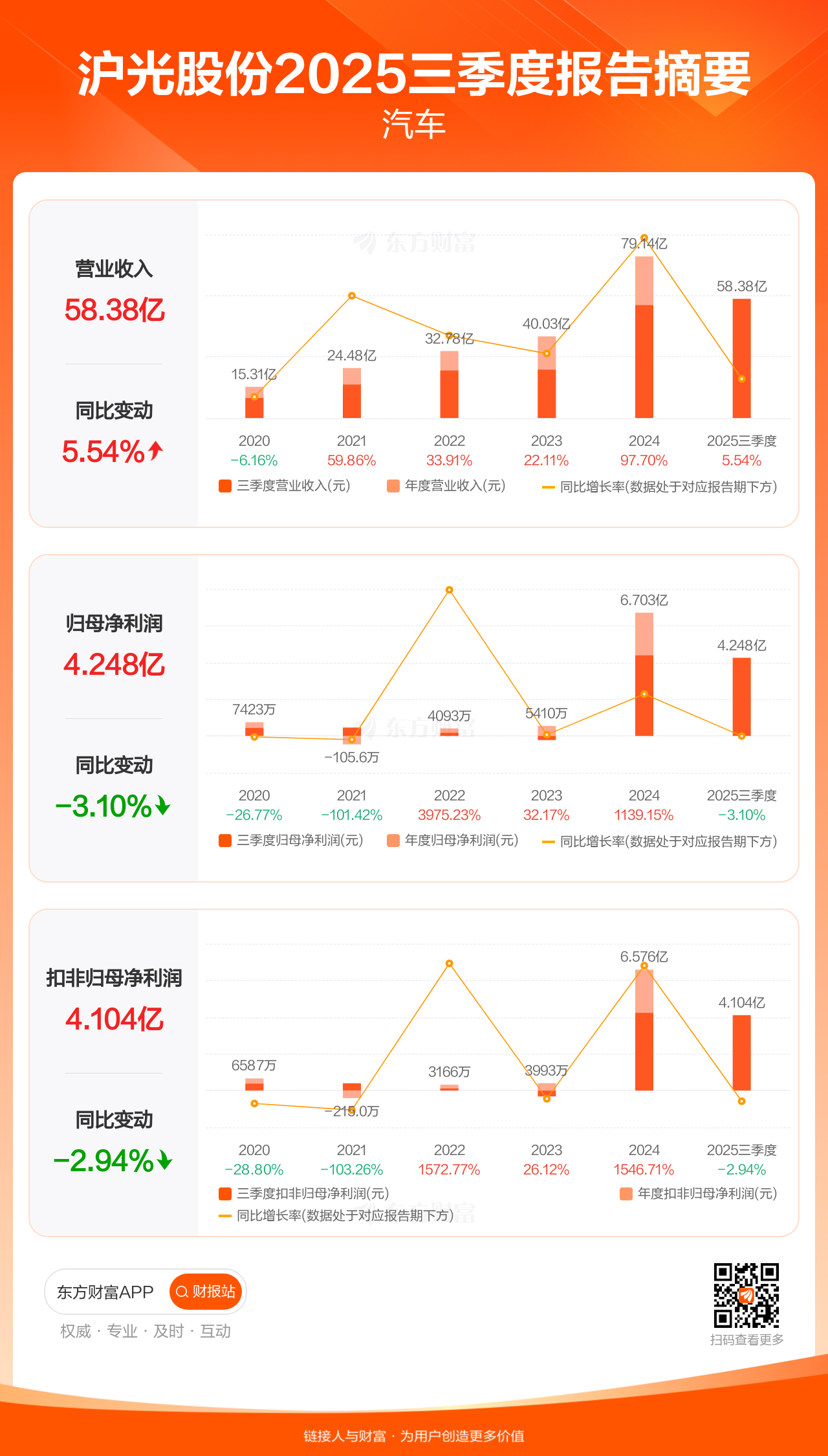 沪光股份10月28日发布2025年三季报显示,公司前三季实现营业收入58.38亿元,同比增长5.54%;归母净利润4.25亿元,同比下滑3.10%;扣非归母净利润4.10亿元,同比下滑2.94%。