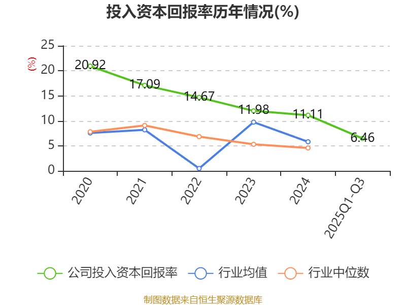 盈利能力方面, 2025年前三季度公司加权平均净资产收益率为7.94%,同比下降4.02个百分点。公司2025年前三季度投入资本回报率为6.46%,较上年同期下降2.52个百分点。