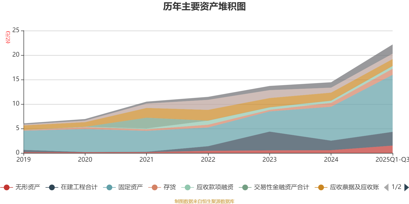 资产重大变化方面,截至2025年三季度末,公司应收票据及应收账款较上年末减少14.17%,占公司总资产比重下降5.01个百分点;固定资产较上年末增加68.38%,占公司总资产比重上升4.66个百分点;无形资产较上年末增加164.49%,占公司总资产比重上升2.87个百分点;商誉占公司总资产的2.77%,上年末为0。