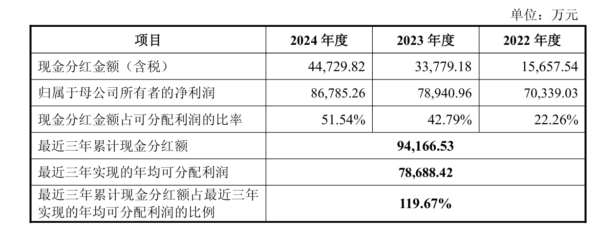 最近三年,公司以现金方式累计分配的利润共计9.42亿元,占最近三年实现的年均可分配利润的119.67%。截至2025年6月30日,公司货币资金高达13.91亿元,资产总额162.80亿元且资产负债率仅35.65%。