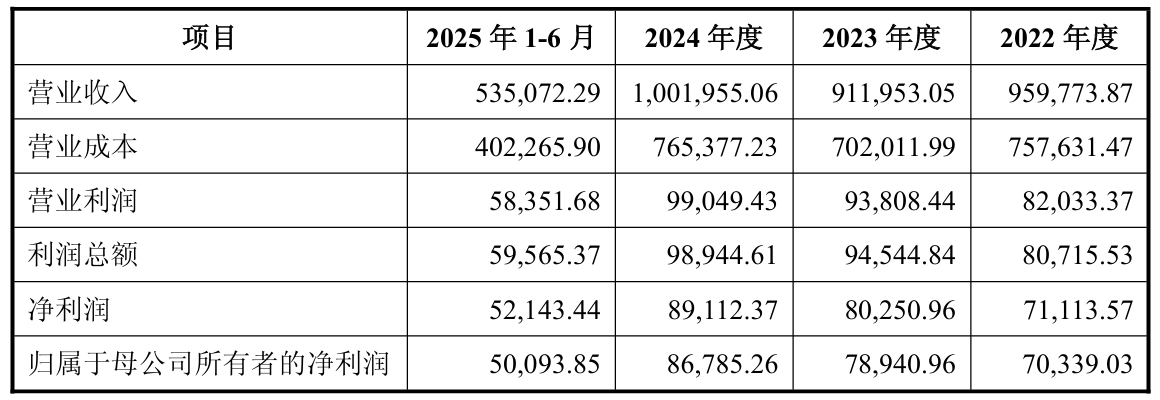2022年至2024年度以及2025年1-6月,公司分别实现营业收入95.98亿元、91.20亿元、100.20亿元、53.51亿元;分别实现净利润7.11亿元、8.03亿元、8.91亿元以及5.21亿元。