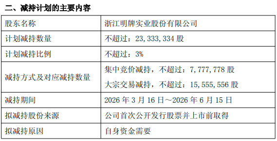 2月12日,菜百股份(605599.SH)公布,大股东明牌实业拟通过集中竞价交易和大宗交易方式合计在2026年3 月16日~2026年6月15日减持不超过2333.33万股(含本数),减持比例不超过公司总股本的3%。