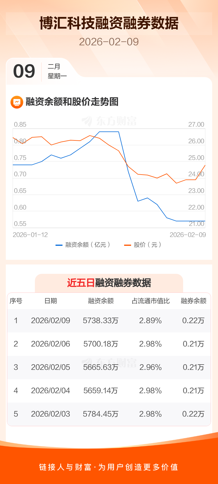 交易所最新数据显示,博汇科技于2026年2月9日获融资买入308.06万元,融资偿还269.91万元,当日融资净买入38.15万元。目前,该股融资余额5738.33万,占流通市值比例为2.89%。