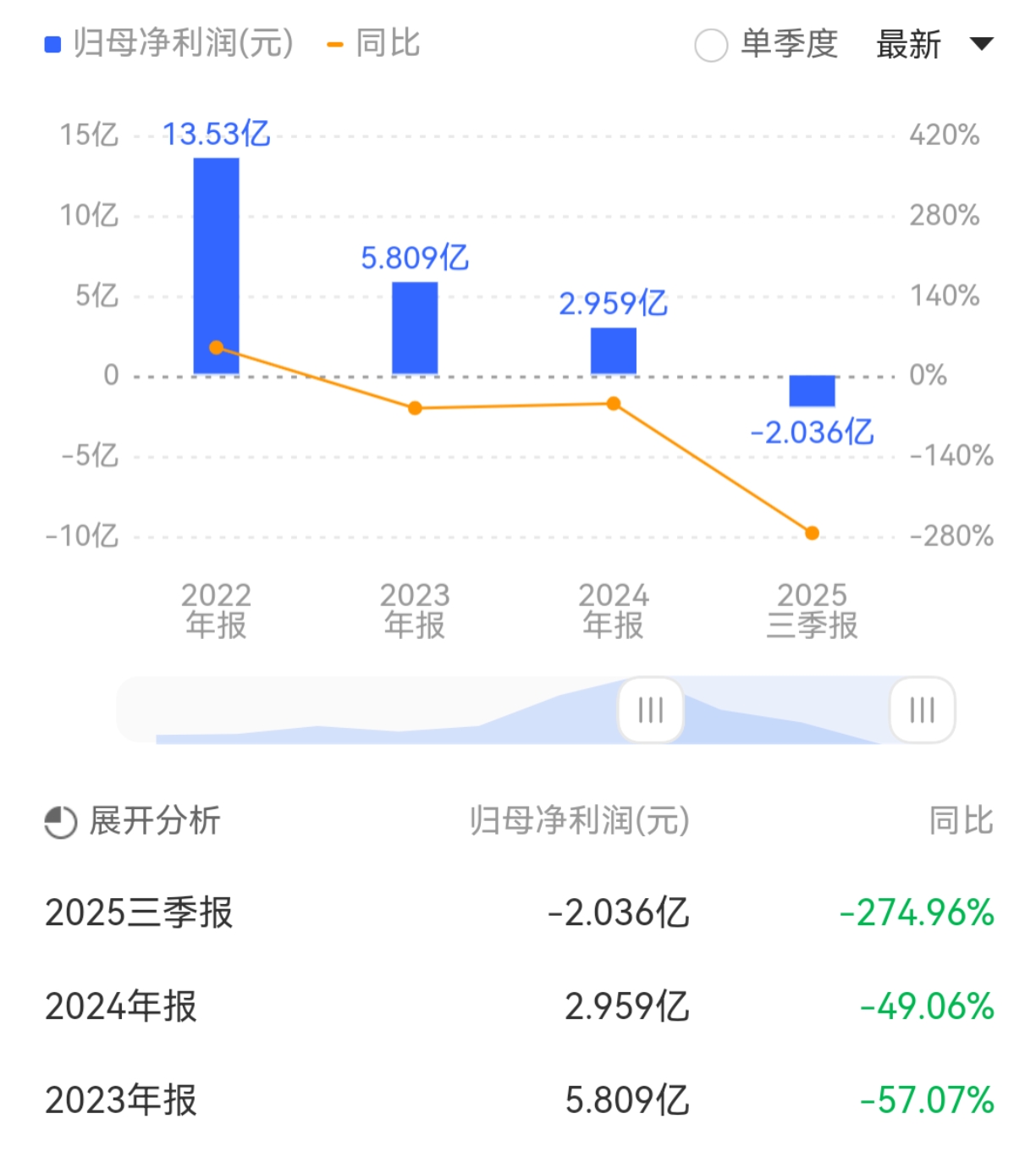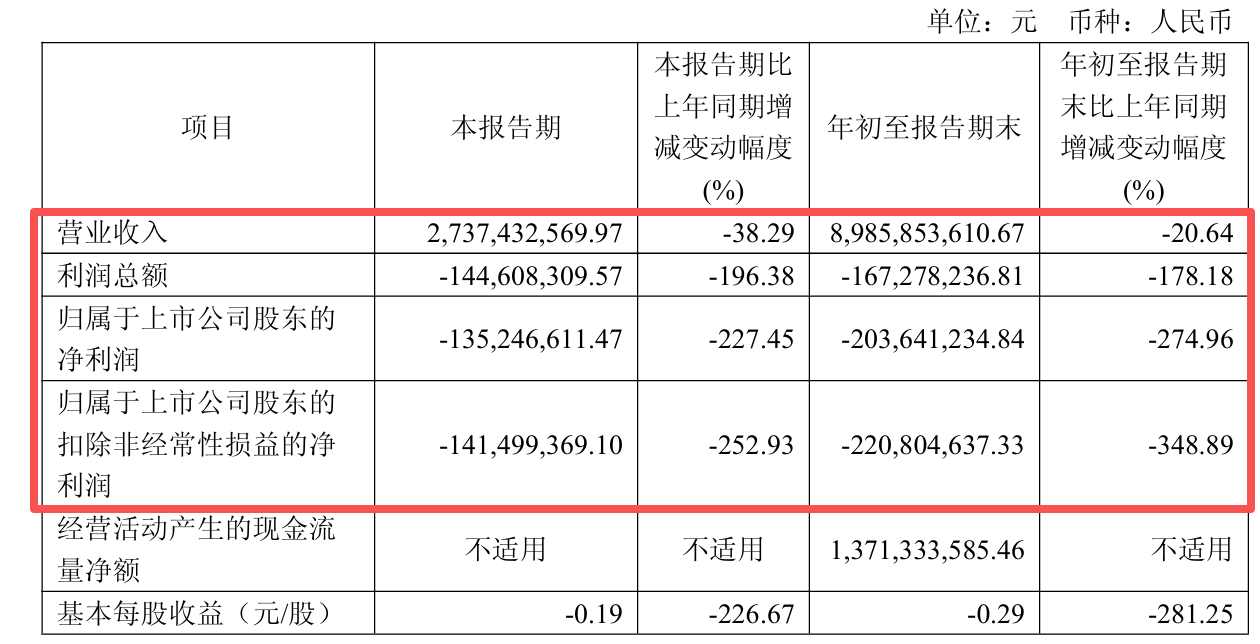 其中,公司第三季度营业收入27.37亿元,同比下降38.29%;归母净利润亏损达1.35亿元,较去年同期骤降227.45%。特别值得注意的是,公司在第二季度亏损额为5297万元,而第三季度的亏损环比激增155%。